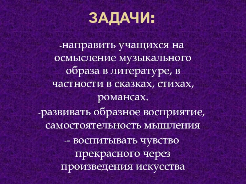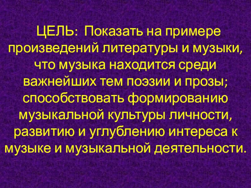 находится среди важнейших тем поэзии и прозы; способствовать формированию музыкальной культуры личности, развитию и углублению интереса к музыке и музыкальной деятельности.