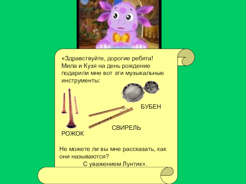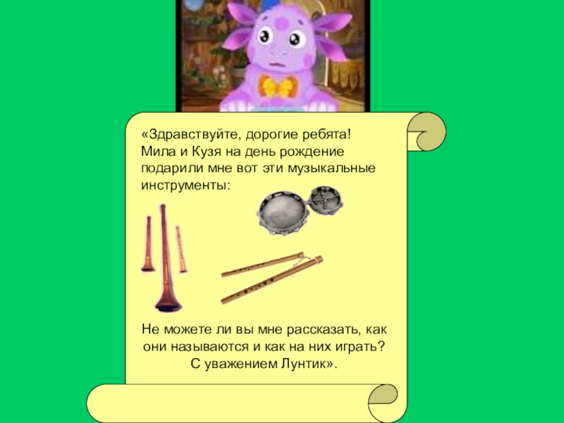 Не можете ли вы мне рассказать, как они называются и как на них играть? С уважением Лунтик».