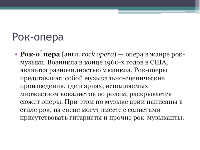 Рок-о́пера (англ. rock opera) — опера в жанре рок-музыки. Возникла в конце 1960-х годов в США, является