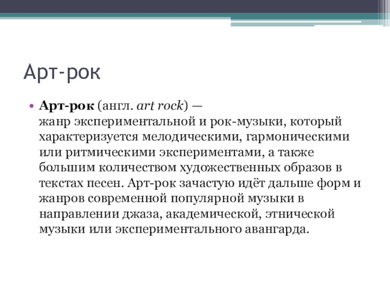 также большим количеством художественных образов в текстах песен. Арт-рок зачастую идёт дальше форм и жанров современной популярной музыки в направлении джаза, академической, этнической музыки или экспериментального авангарда.