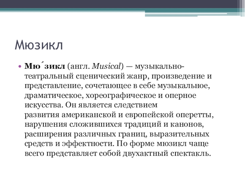 хореографическое и оперное искусства. Он является следствием развития американской и европейской оперетты, нарушения сложившихся традиций и канонов, расширения различных границ, выразительных средств и эффектности. По форме мюзикл чаще всего представляет собой двухактный спектакль.