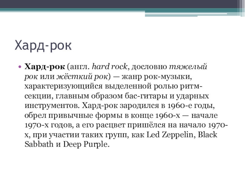 бас-гитары и ударных инструментов. Хард-рок зародился в 1960-е годы, обрел привычные формы в конце 1960-х — начале 1970-х годов, а его расцвет пришёлся на начало 1970-х, при участии таких групп, как Led Zeppelin, Black Sabbath и Deep Purple.