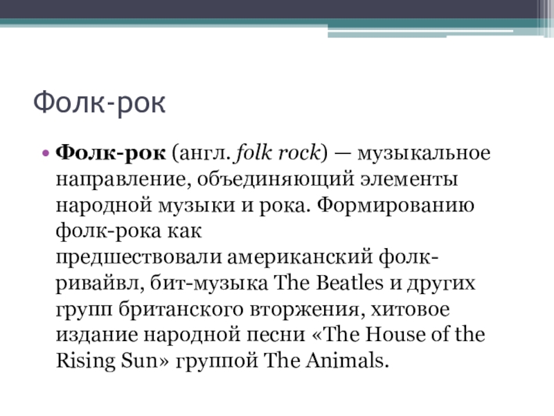 фолк-рока как предшествовали американский фолк-ривайвл, бит-музыка The Beatles и других групп британского вторжения, хитовое издание народной песни «The House of the Rising Sun» группой The Animals.