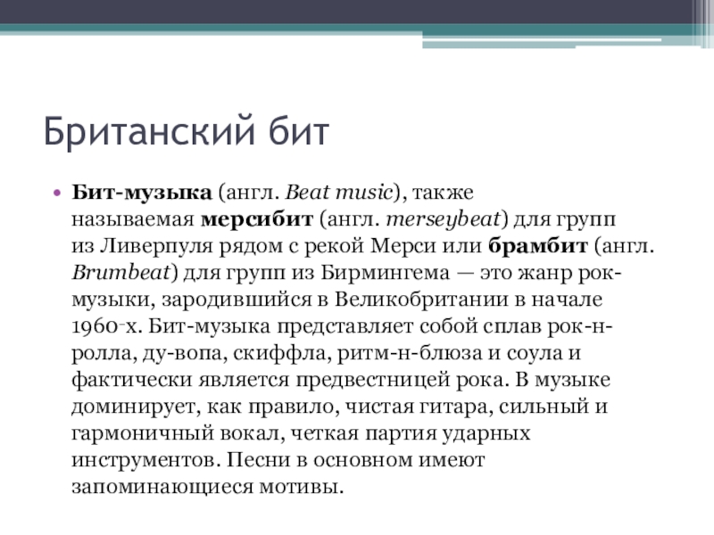 Бит-музыка (англ. Beat music), также называемая мерсибит (англ. merseybeat) для групп из Ливерпуля рядом с рекой Мерси или брамбит (англ.