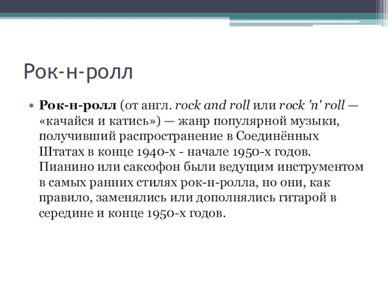 музыки, получивший распространение в Соединённых Штатах в конце 1940-х - начале 1950-х годов. Пианино или саксофон были ведущим инструментом в самых ранних стилях рок-н-ролла, но они, как правило, заменялись или дополнялись гитарой в середине и конце 1950-х годов.