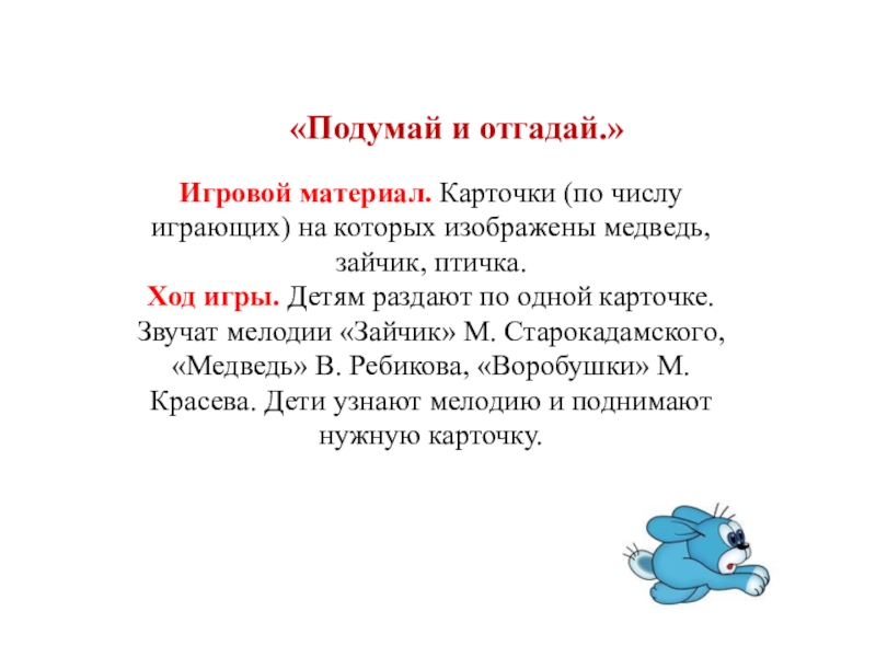 Ход игры. Детям раздают по одной карточке. Звучат мелодии «Зайчик» М. Старокадамского, «Медведь» В. Ребикова, «Воробушки» М. Красева. Дети узнают мелодию и поднимают нужную карточку.