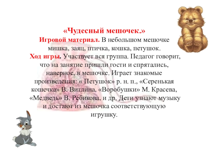 игры. Участвует вся группа. Педагог говорит, что на занятие пришли гости и спрятались, наверное, в мешочке. Играет знакомые произведения: « Петушок» р. н. п., «Серенькая кошечка» В. Витлина, «Воробушки» М. Красева, «Медведь» В. Ребикова, и др. Дети узнают музыку и достают из мешочка соответствующую игрушку.