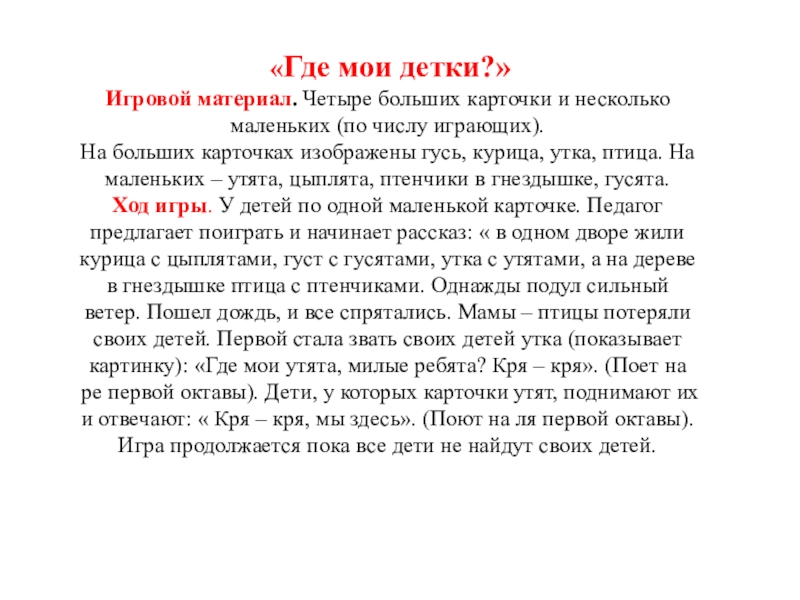 Ход игры. У детей по одной маленькой карточке. Педагог предлагает поиграть и начинает рассказ: « в одном дворе жили курица с цыплятами, густ с гусятами, утка с утятами, а на дереве в гнездышке птица с птенчиками. Однажды подул сильный ветер. Пошел дождь, и все спрятались. Мамы – птицы потеряли своих детей. Первой стала звать своих детей утка (показывает картинку): «Где мои утята, милые ребята? Кря – кря». (Поет на ре первой октавы). Дети, у которых карточки утят, поднимают их и отвечают: « Кря – кря, мы здесь». (Поют на ля первой октавы). Игра продолжается пока все дети не найдут своих детей.