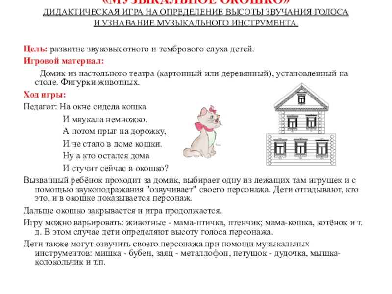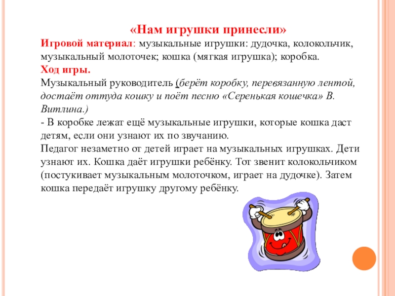 Педагог незаметно от детей играет на музыкальных игрушках. Дети узнают их. Кошка даёт игрушки ребёнку. Тот звенит колокольчиком (постукивает музыкальным молоточком, играет на дудочке). Затем кошка передаёт игрушку другому ребёнку.