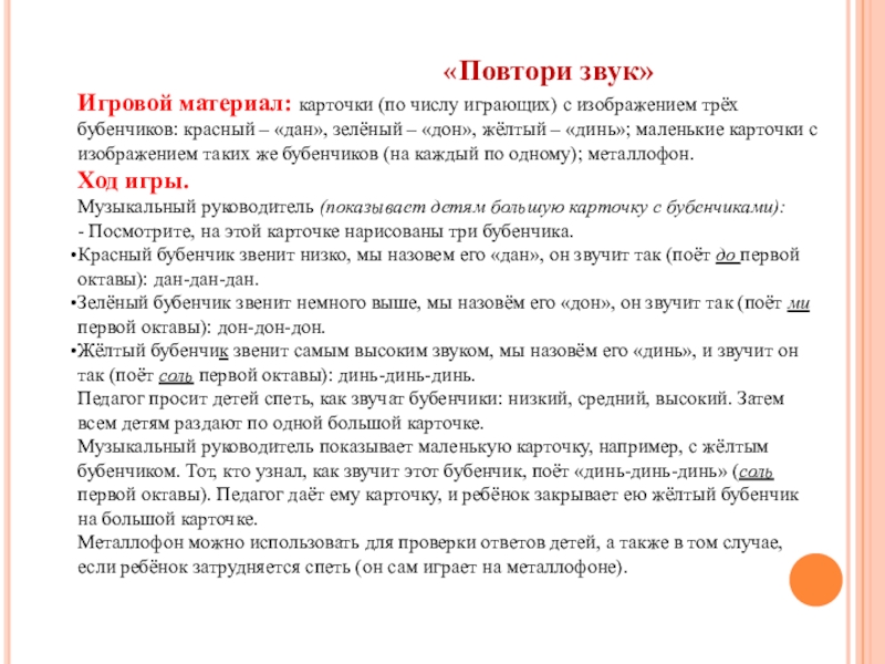 Игровой материал: карточки (по числу играющих) с изображением трёх бубенчиков: красный – «дан», зелёный – «дон», жёлтый – «динь»; маленькие карточки с изображением таких же бубенчиков (на каждый по одному); металлофон.