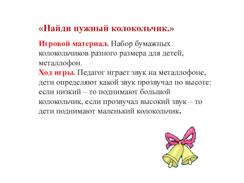 Ход игры. Педагог играет звук на металлофоне, дети определяют какой звук прозвучал по высоте: если низкий – то поднимают большой колокольчик, если прозвучал высокий звук – то дети поднимают маленький колокольчик.