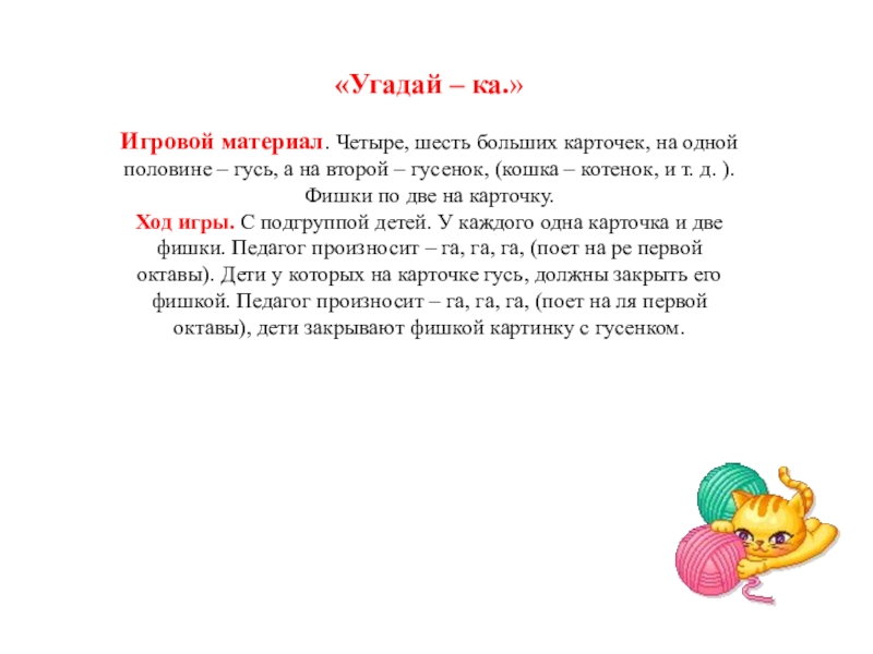 Ход игры. С подгруппой детей. У каждого одна карточка и две фишки. Педагог произносит – га, га, га, (поет на ре первой октавы). Дети у которых на карточке гусь, должны закрыть его фишкой. Педагог произносит – га, га, га, (поет на ля первой октавы), дети закрывают фишкой картинку с гусенком.