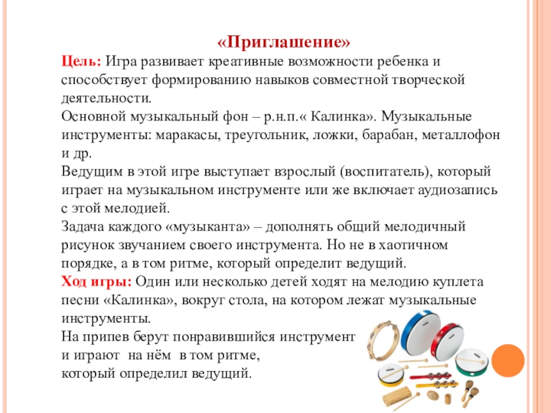 Ход игры: Один или несколько детей ходят на мелодию куплета песни «Калинка», вокруг стола, на котором лежат музыкальные инструменты.