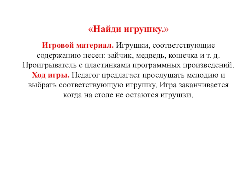 Ход игры. Педагог предлагает прослушать мелодию и выбрать соответствующую игрушку. Игра заканчивается когда на столе не остаются игрушки.