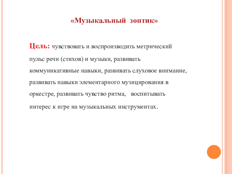 Цель: чувствовать и воспроизводить метрический пульс речи (стихов) и музыки,