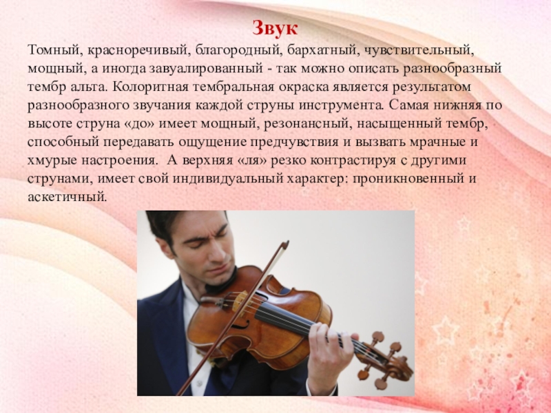 чарующим певучим тембром очень похожим на человеческий голос. В то же время весьма выразительный и виртуозный, требующий точной настройки и регулировки. Неслучайно именно скрипке отдана роль «королевы оркестра».
