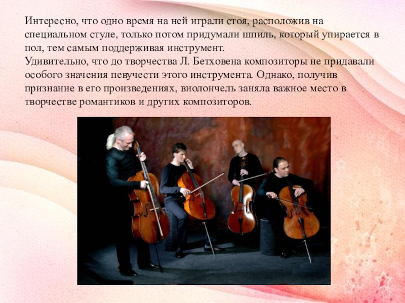 Удивительно, что до творчества Л. Бетховена композиторы не придавали особого значения певучести этого инструмента. Однако, получив признание в его произведениях, виолончель заняла важное место в творчестве романтиков и других композиторов.