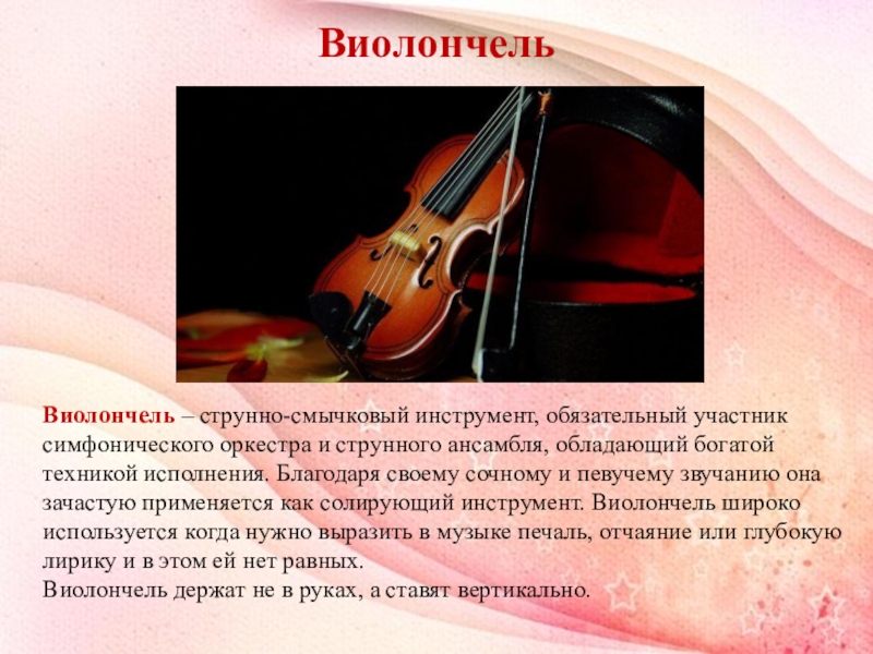 Слайд 2Виолончель – струнно-смычковый инструмент, обязательный участник симфонического оркестра и струнного ансамбля,