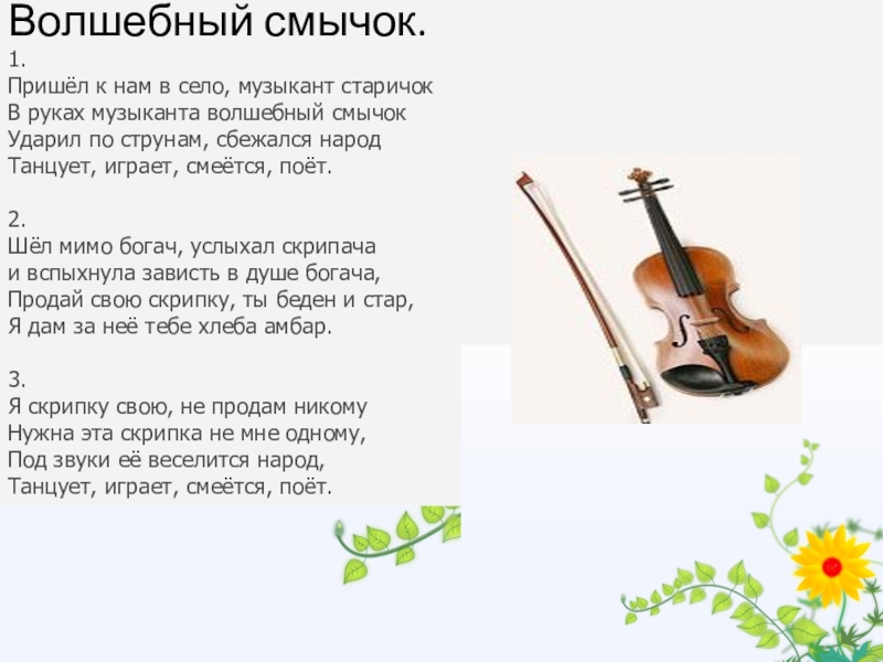 Волшебный смычок.1.Пришёл к нам в село, музыкант старичокВ руках музыканта волшебный смычок Ударил по струнам, сбежался народ