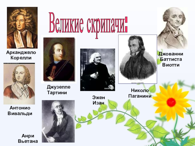 Великие скрипачи: Арканджело КореллиАнтонио ВивальдиДжузеппе ТартиниДжованни Баттиста ВиоттиАнри ВьетанаЭжен ИзанНиколо Паганини