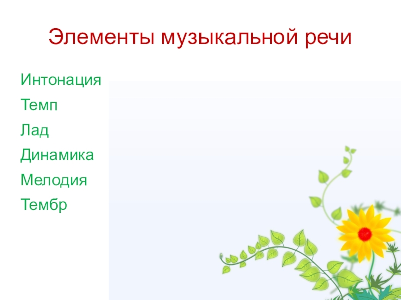Элементы музыкальной речиИнтонацияТемпЛадДинамикаМелодияТембр
