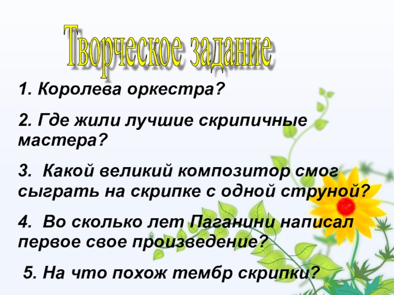 Творческое задание 1. Королева оркестра?2. Где жили лучшие скрипичные мастера?3. Какой великий композитор смог сыграть на скрипке