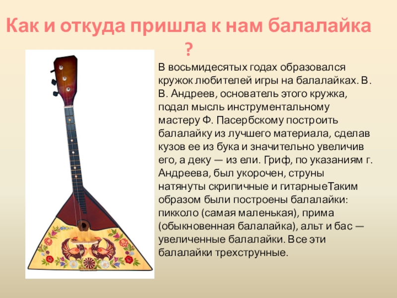кружок любителей игры на балалайках. В.В. Андреев, основатель этого кружка, подал мысль инструментальному мастеру Ф. Пасербскому построить балалайку из лучшего материала, сделав кузов ее из бука и значительно увеличив его, а деку — из ели. Гриф, по указаниям г. Андреева, был укорочен, струны натянуты скрипичные и гитарныеТаким образом были построены балалайки: пикколо (самая маленькая), прима (обыкновенная балалайка), альт и бас — увеличенные балалайки. Все эти балалайки трехструнные.