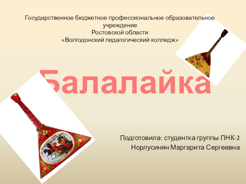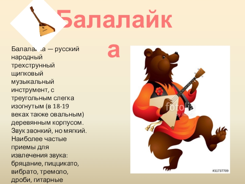 Слайд 2Балалайка — русский народный трехструнный щипковый музыкальный инструмент, с треугольным слегка