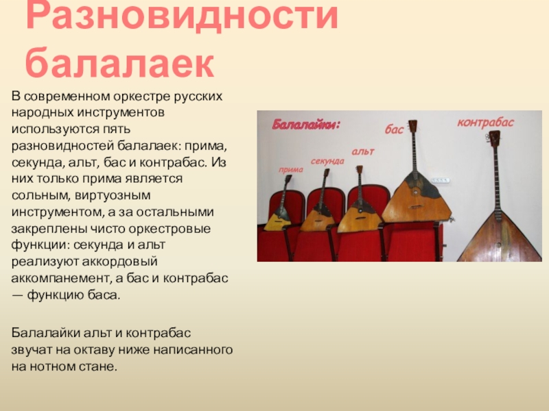 балалаек: прима, секунда, альт, бас и контрабас. Из них только прима является сольным, виртуозным инструментом, а за остальными закреплены чисто оркестровые функции: секунда и альт реализуют аккордовый аккомпанемент, а бас и контрабас — функцию баса.