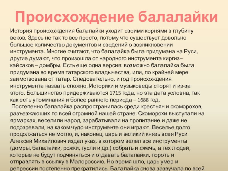 не так то все просто, потому что существует довольно большое количество документов и сведений о возникновении инструмента. Многие считают, что балалайка была придумана на Руси, другие думают, что произошла от народного инструмента киргиз–кайсаков – домбры. Есть еще одна версия: возможно балалайка была придумана во время татарского владычества, или, по крайней мере заимствована от татар. Следовательно, и год происхождения инструмента назвать сложно. Историки и музыковеды спорят и из-за этого. Большинство придерживаются 1715 года, но эта дата условна, так как есть упоминания и более раннего периода – 1688 год.