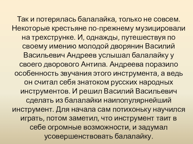 на трехструнке. И, однажды, путешествуя по своему имению молодой дворянин Василий Васильевич Андреев услышал балалайку у своего дворового Антипа. Андреева поразило особенность звучания этого инструмента, а ведь он считал себя знатоком русских народных инструментов. И решил Василий Васильевич сделать из балалайки наипопулярнейший инструмент. Для начала сам потихоньку научился играть, потом заметил, что инструмент таит в себе огромные возможности, и задумал усовершенствовать балалайку.
