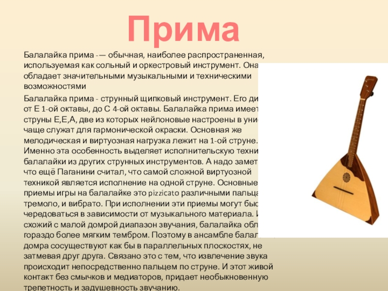 Балалайка прима - струнный щипковый инструмент. Его диапазон от Е 1-ой октавы, до С 4-ой октавы. Балалайка прима имеет 3 струны Е,Е,А, две из которых нейлоновые настроены в унисон и чаще служат для гармонической окраски. Основная же мелодическая и виртуозная нагрузка лежит на 1-ой струне. Именно эта особенность выделяет исполнительскую технику балалайки из других струнных инструментов. А надо заметить, что ещё Паганини считал, что самой сложной виртуозной техникой является исполнение на одной струне. Основные приемы игры на балалайке это pizzicato различными пальцами, тремоло, и вибрато. При исполнении эти приемы могут быстро чередоваться в зависимости от музыкального материала. Имея схожий с малой домрой диапазон звучания, балалайка обладает гораздо более мягким тембром. Поэтому в ансамбле балалайка и домра сосуществуют как бы в параллельных плоскостях, не затмевая друг друга. Связано это с тем, что извлечение звука происходит непосредственно пальцем по струне. И этот живой контакт без смычков и медиаторов, придает необыкновенную трепетность и задушевность звучанию.