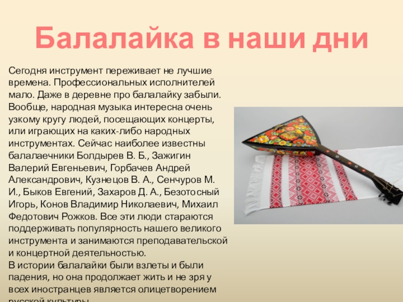 В истории балалайки были взлеты и были падения, но она продолжает жить и не зря у всех иностранцев является олицетворением русской культуры.