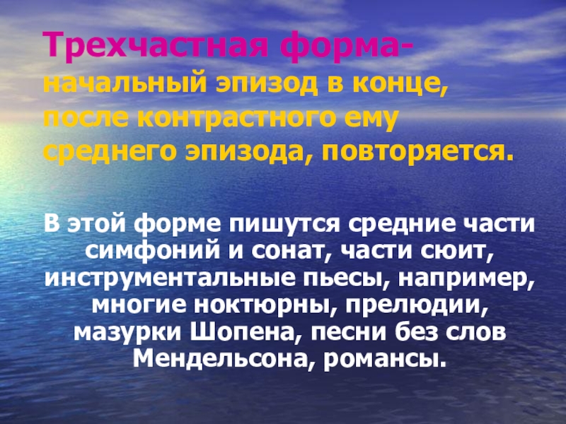 В этой форме пишутся средние части симфоний и сонат, части сюит, инструментальные пьесы, например, многие ноктюрны, прелюдии, мазурки Шопена, песни без слов Мендельсона, романсы.