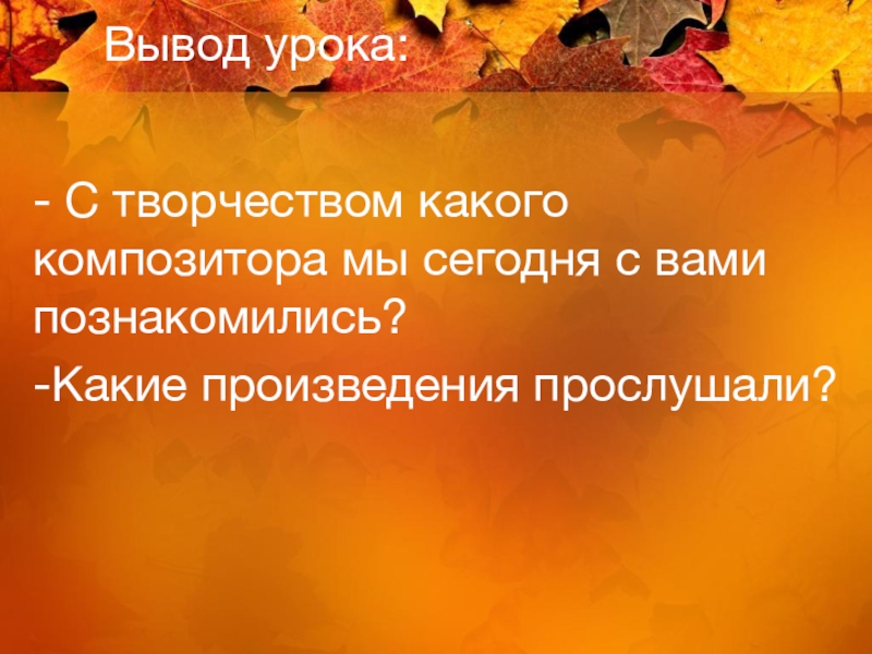 Вывод урока:- С творчеством какого композитора мы сегодня с вами познакомились?-Какие произведения прослушали?