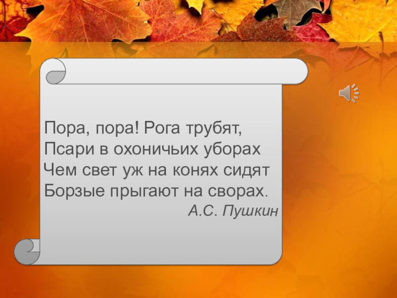 Пора, пора! Рога трубят,Псари в охоничьих уборахЧем свет уж на конях сидятБорзые прыгают на сворах.А.С. Пушкин