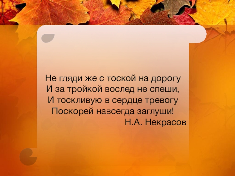 Не гляди же с тоской на дорогуИ за тройкой вослед не спеши,И тоскливую в сердце тревогуПоскорей навсегда заглуши!Н.А. Некрасов