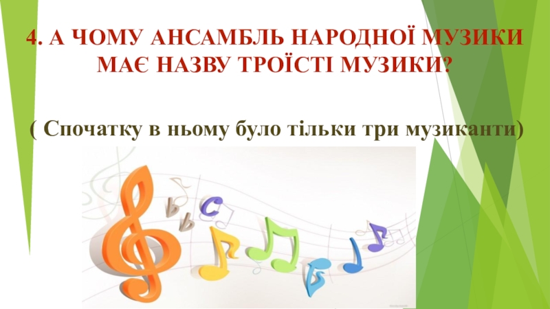 4. А ЧОМУ АНСАМБЛЬ НАРОДНОЇ МУЗИКИ МАЄ НАЗВУ ТРОЇСТІ МУЗИКИ?( Спочатку в ньому було тільки три музиканти)