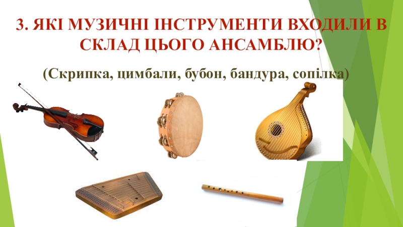 3. ЯКІ МУЗИЧНІ ІНСТРУМЕНТИ ВХОДИЛИ В СКЛАД ЦЬОГО АНСАМБЛЮ?(Скрипка, цимбали, бубон, бандура, сопілка)