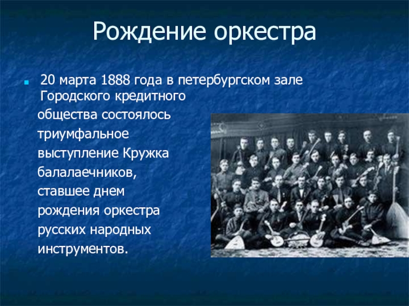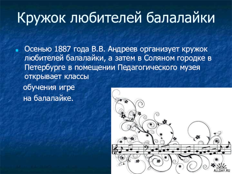 Осенью 1887 года В.В. Андреев организует кружок любителей балалайки,