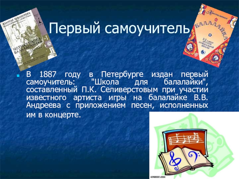 балалайки", составленный П.К. Селиверстовым при участии известного артиста игры на балалайке В.В. Андреева с приложением песен, исполненных им в концерте.