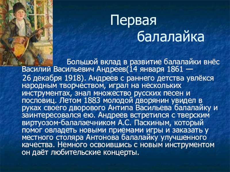 Большой вклад в развитие балалайки внёс Василий Васильевич Андреев(14 января 1861 —