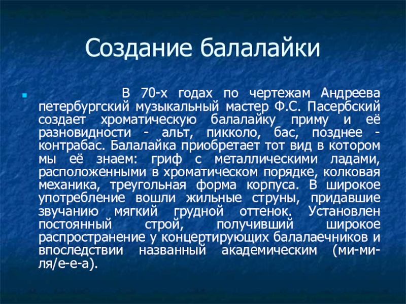 петербургский музыкальный мастер Ф.С. Пасербский создает хроматическую балалайку приму и её разновидности - альт, пикколо, бас, позднее - контрабас. Балалайка приобретает тот вид в котором мы её знаем: гриф с металлическими ладами, расположенными в хроматическом порядке, колковая механика, треугольная форма корпуса. В широкое употребление вошли жильные струны, придавшие звучанию мягкий грудной оттенок. Установлен постоянный строй, получивший широкое распространение у концертирующих балалаечников и впоследствии названный академическим (ми-ми-ля/e-e-a).