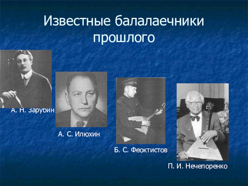 балалайках, веселили народ на ярмарках. Балалайки того времени сильно различались и по форме и по строю, потому как не было единого стандарта и каждый мастер/музыкант делал инструмент на свой лад (встречались балалайки различной формы: круглые, треугольные, четырехугольные, трапецивидные, и с разным количеством струн ( от двух до пяти). Знания о приёмах игры и репертуар передавались от отцов и дедов к сыновьям и внукам в устной форме.