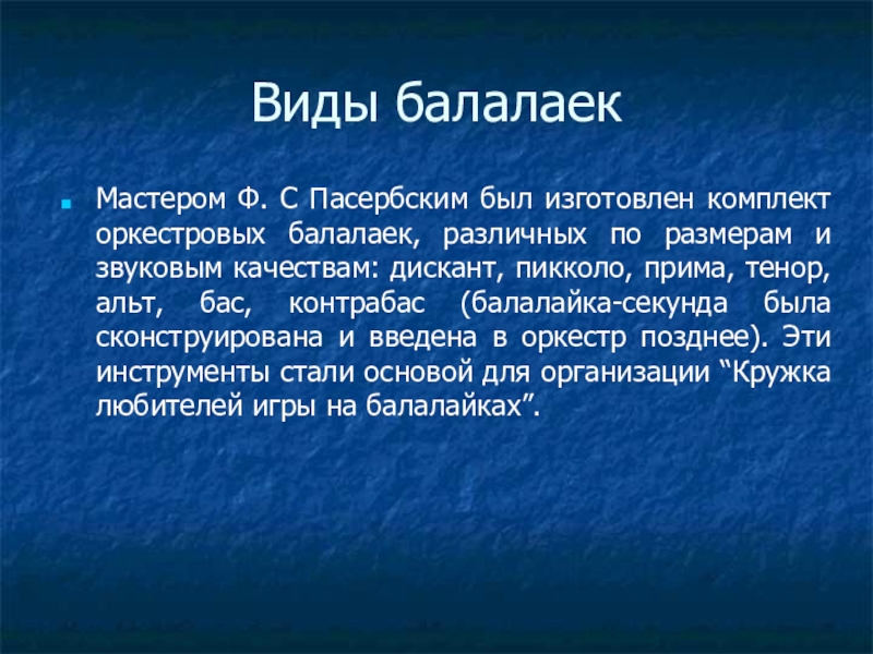 Мастером Ф. С Пасербским был изготовлен комплект оркестровых балалаек, различных