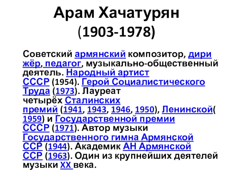 Социалистического Труда (1973). Лауреат четырёх Сталинских премий (1941, 1943, 1946, 1950), Ленинской(1959) и Государственной премии СССР (1971). Автор музыки Государственного гимна Армянской ССР (1944). Академик АН Армянской ССР (1963). Один из крупнейших деятелей музыки XX века.