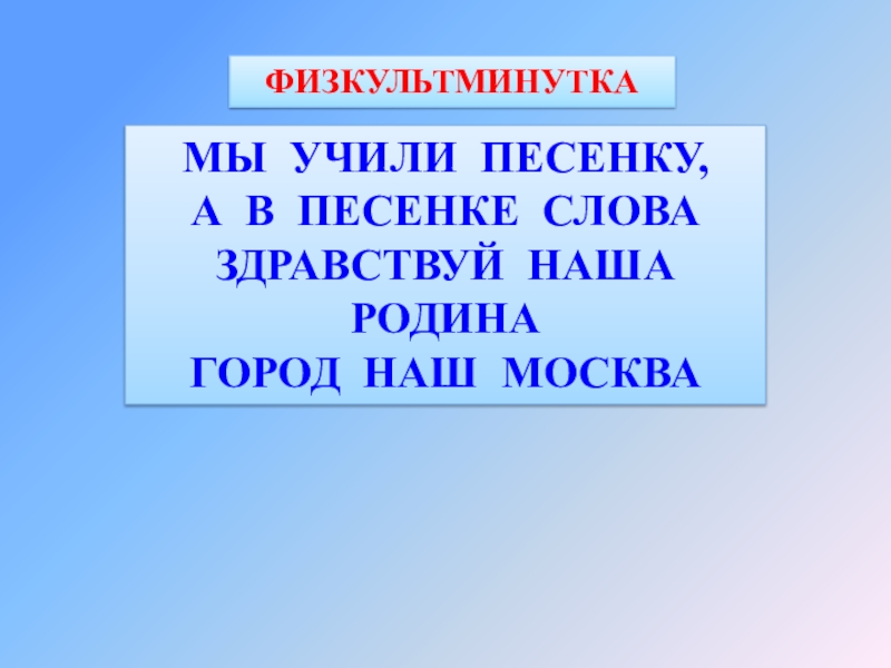 ФИЗКУЛЬТМИНУТКАМЫ УЧИЛИ ПЕСЕНКУ,А В ПЕСЕНКЕ СЛОВАЗДРАВСТВУЙ НАША РОДИНАГОРОД НАШ МОСКВА