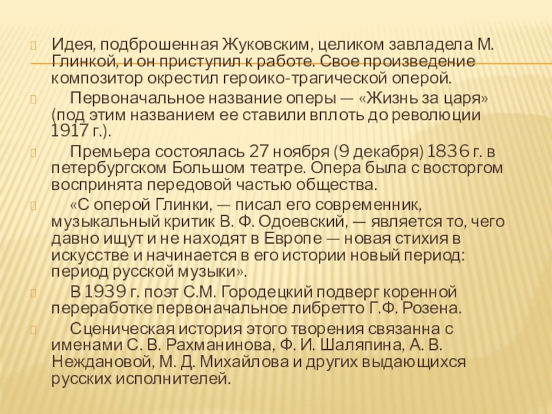 «С оперой Глинки, — писал его современник, музыкальный критик В. Ф. Одоевский, — является то, чего давно ищут и не находят в Европе — новая стихия в искусстве и начинается в его истории новый период: период русской музыки».