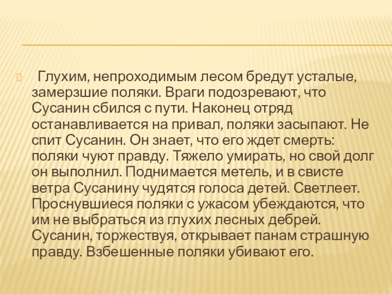 Слайд 13  Глухим, непроходимым лесом бредут усталые, замерзшие поляки. Враги подозревают, что
