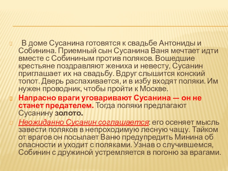 сын Сусанина Ваня мечтает идти вместе с Собининым против поляков. Вошедшие крестьяне поздравляют жениха и невесту, Сусанин приглашает их на свадьбу. Вдруг слышится конский топот. Дверь распахивается, и в избу входят поляки. Им нужен проводник, чтобы пройти к Москве.